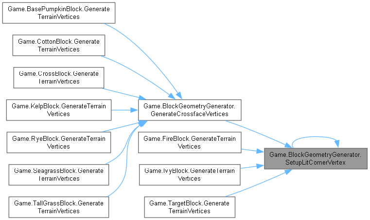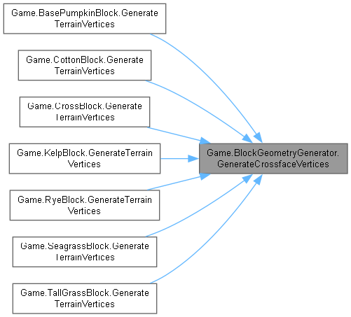 | virtual void | GenerateCrossfaceVertices (Block block, int value, int x, int y, int z, Color color, int textureSlot, TerrainGeometrySubset subset) |