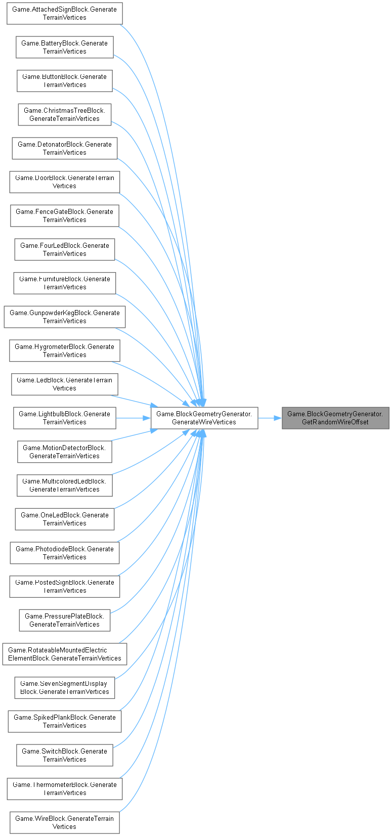 | virtual void | GenerateWireVertices (int value, int x, int y, int z, int mountingFace, float centerBoxSize, Vector2 centerOffset, TerrainGeometrySubset subset) |
