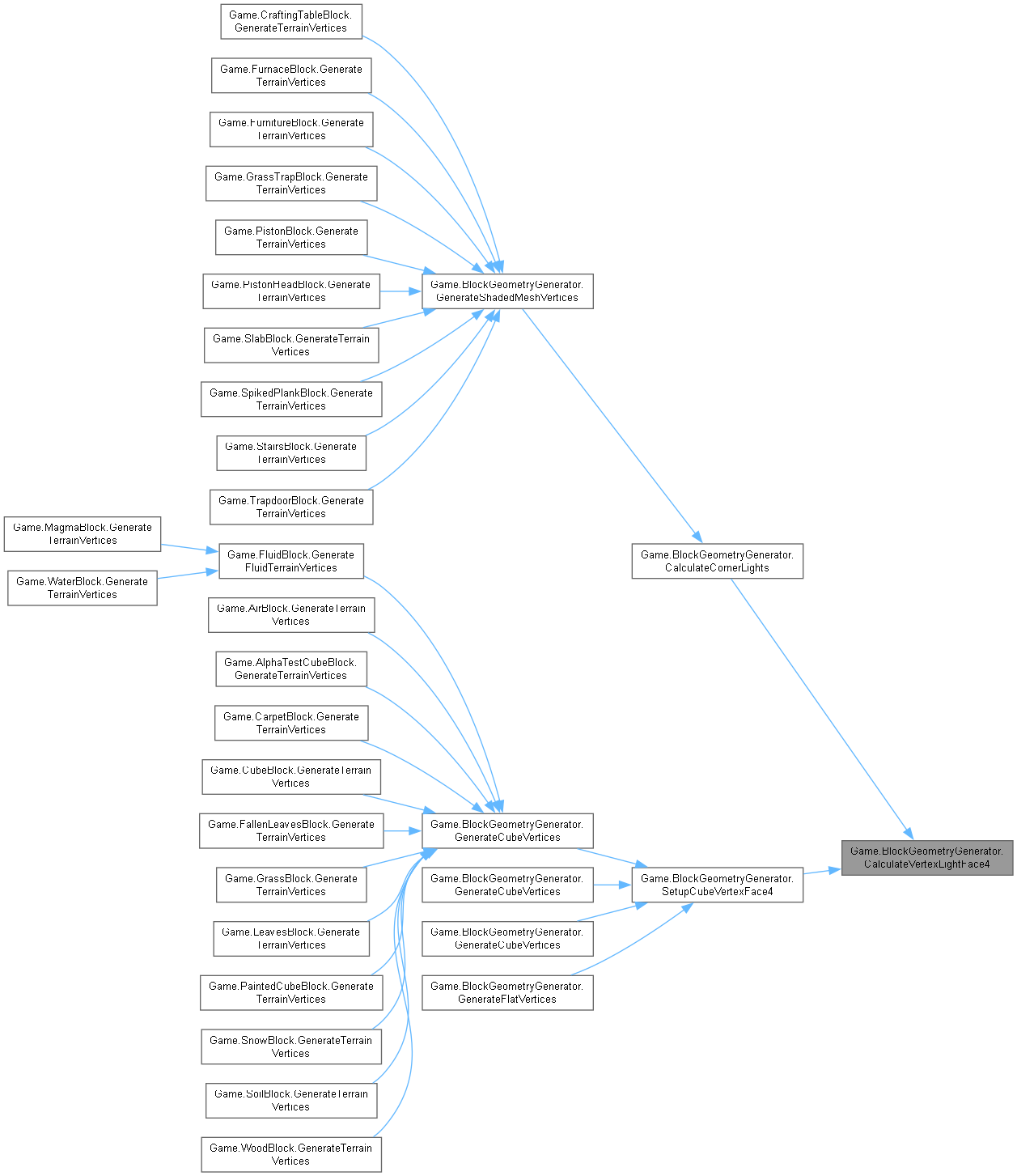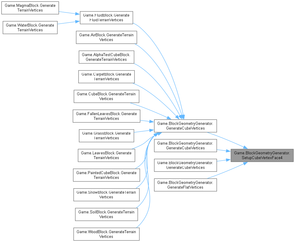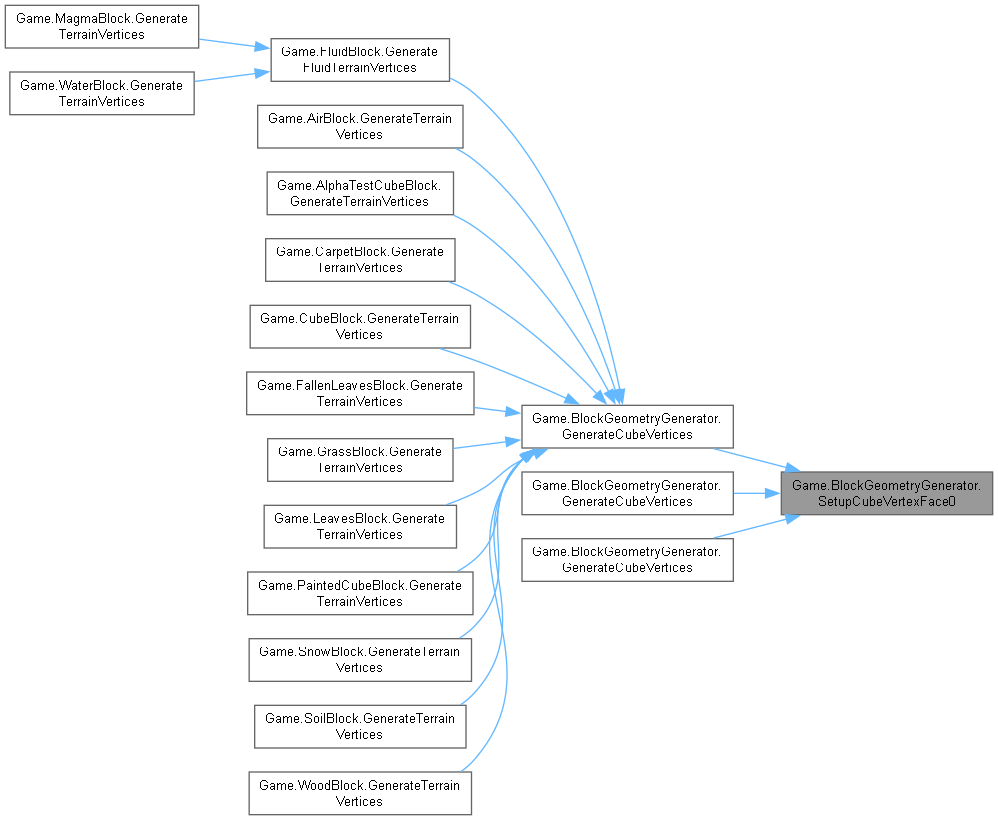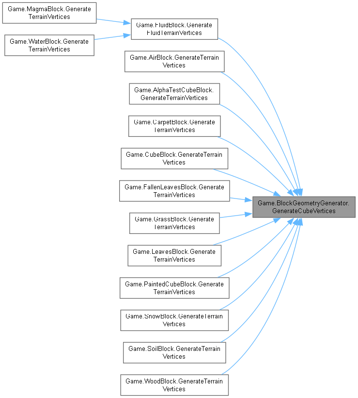 | virtual void | GenerateCubeVertices (Block block, int value, int x, int y, int z, Color color, TerrainGeometrySubset[] subsetsByFace) |