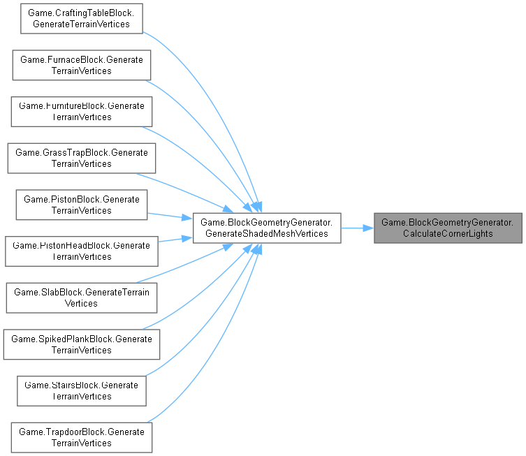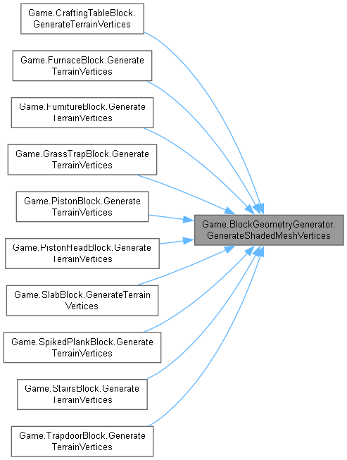 | virtual void | GenerateShadedMeshVertices (Block block, int x, int y, int z, BlockMesh blockMesh, Color color, Matrix? matrix, int[] facesMap, TerrainGeometrySubset subset) |