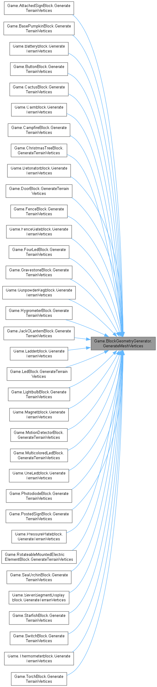 | virtual void | GenerateMeshVertices (Block block, int x, int y, int z, BlockMesh blockMesh, Color color, Matrix? matrix, TerrainGeometrySubset subset) |
