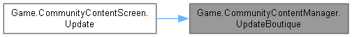 | static void | UpdateBoutique (string type, int id, int boutique, CancellableProgress progress, Action< byte[]> success, Action< Exception > failure) |