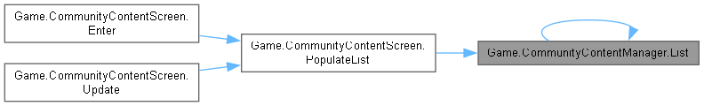 | static void | List (string cursor, string userFilter, string typeFilter, string moderationFilter, string sortOrder, string keySearch, string searchType, CancellableProgress progress, Action< List< CommunityContentEntry >, string > success, Action< Exception > failure) |