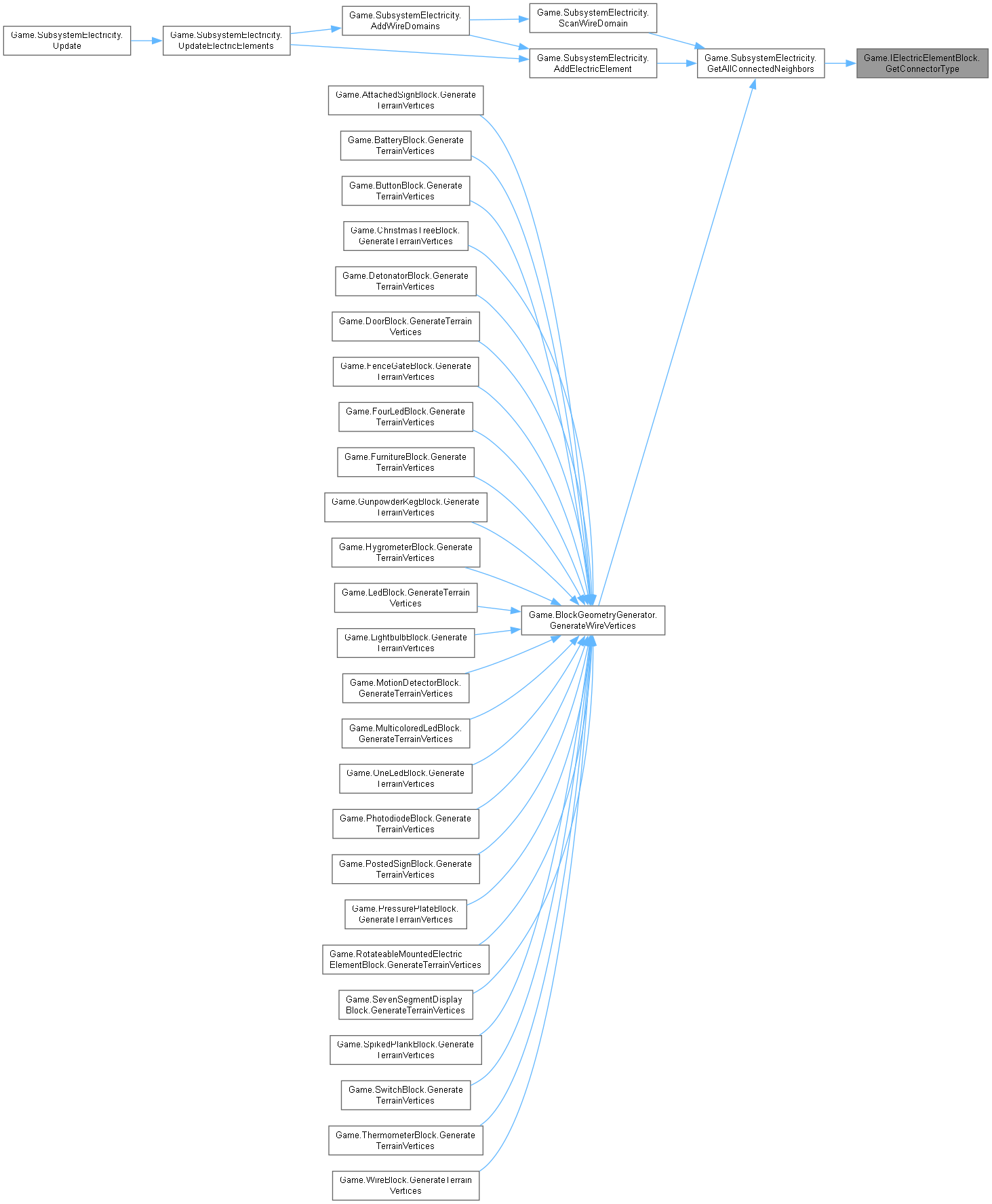 在 Game.AttachedSignBlock, Game.BatteryBlock, Game.ChristmasTreeBlock, Game.DispenserBlock, Game.DoorBlock, Game.FenceGateBlock, Game.FurnitureBlock, Game.GunpowderKegBlock, Game.HygrometerBlock, Game.MountedElectricElementBlock, Game.PistonBlock, Game.PostedSignBlock, Game.ThermometerBlock, Game.TrapdoorBlock, Game.WireBlock , 以及 Game.WireThroughBlock 内被实现.